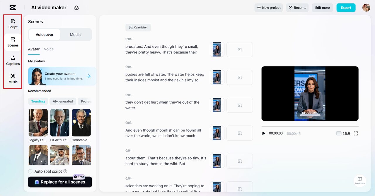 Step 2: Create a video Head to the “Scenes” tab to bring your script to life with voiceovers. You can select from a range of AI avatars or switch to the “Voice” section if you prefer only narration. Choose a voice and hit “Apply for all scenes” for uniformity. Visit “Captions” to insert dynamic subtitles, then enhance with background sound from the “Music” tab to boost engagement.
